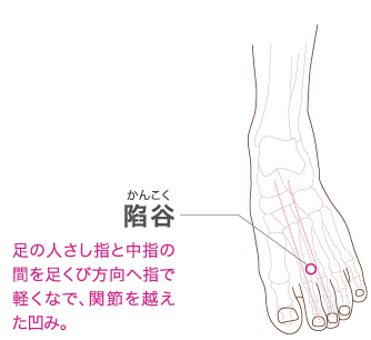 陥谷の場所は、足の人差し指と中指の骨が分かれる部分の少し手前にあるくぼみです。探し方は、足の指の間を指でなで上げ、指がぶつかる骨の結合部の前のくぼみを探してください。症状のある方は押すとズーンとした響きが出ます!胃の不調、むくみ、口内炎などの消化器系の不調に効果があるとされます。1セット3~5回を目安に息を吐きながら5秒前後ツボ押ししてみましょう♪