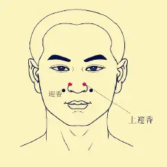 迎香は小鼻のすぐ横にある窪みになります。また迎香よりも若干上の鼻の付け根の横にある「上迎香」もオススメです。症状のあるかたは迎香や上迎香を押すとズーンとした響きや痛みが出たりします。5秒程度ツボ押ししてみましょう。鼻水、鼻づまりなどに効果的です。